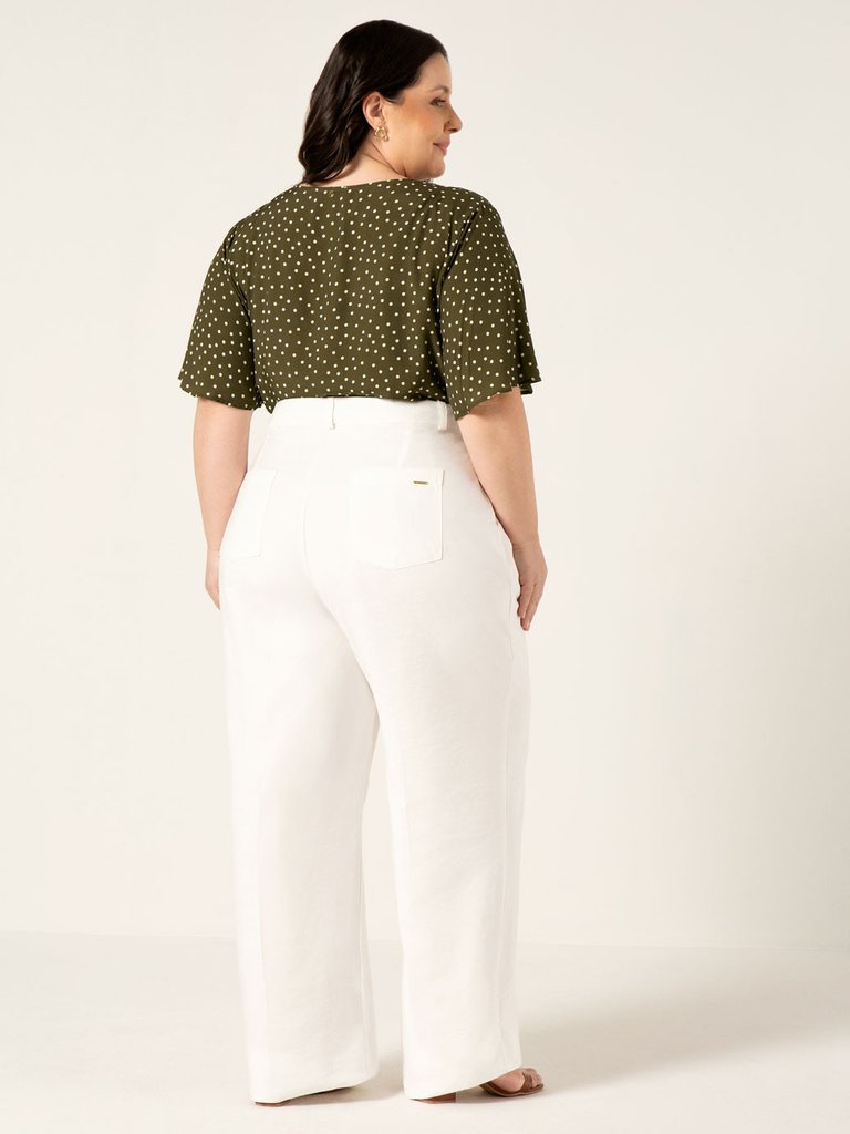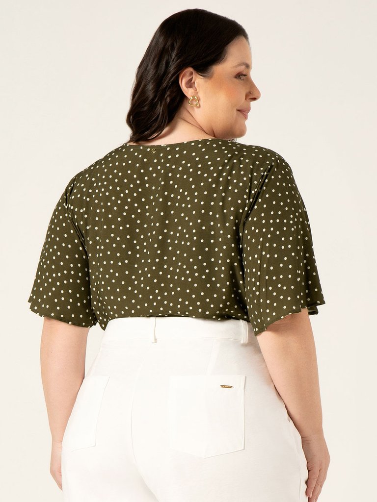 A Blusa Isolde é confeccionada em viscose, tecido leve e fluido que oferece comodidade ao vestir. Sua modelagem é solta ao corpo, proporcionando uma vestibilidade confortável sem abrir mão da elegância. A blusa possui decote em V e mangas com corte evasê. Sua estampa em poá é clássica e atemporal, o poá ganha uma releitura moderna nesta composição com fundo verde militar e bolinhas na cor off-white. O contraste suave entre o tom terroso e neutro do fundo e os poás claros cria um visual equilibrado, que transmite elegância com um toque retrô.