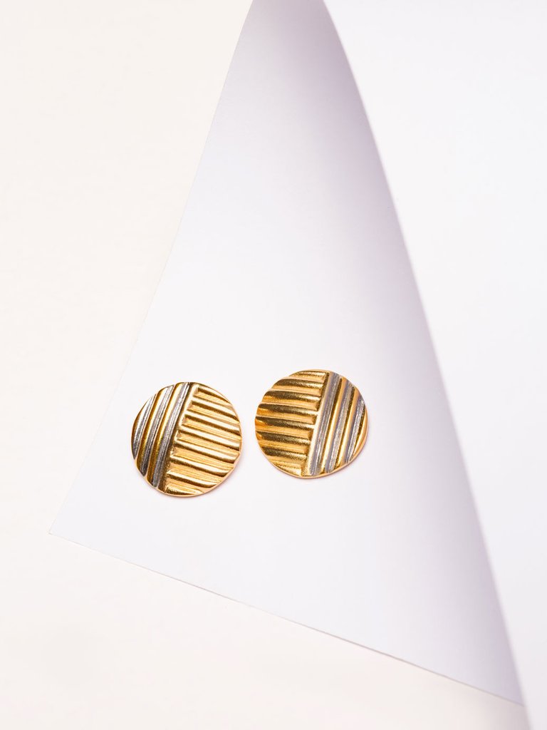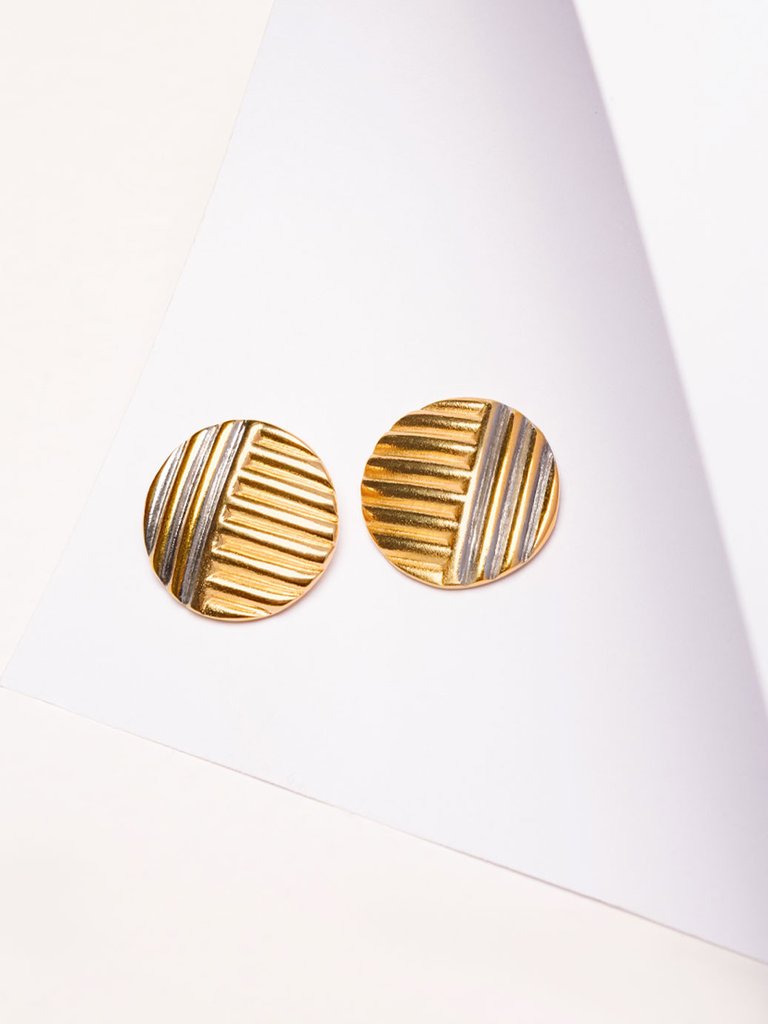 O brinco Atenas tem formato redondo com textura, traduz elegância contemporânea em um design marcante e sofisticado. Com formato circular e superfície trabalhada em relevos lineares, a peça combina o brilho do dourado com o contraste do prateado em uma composição bicolor que cria profundidade e dinamismo visual. Confeccionado em metal com banho em ouro e prata, apresenta aproximadamente 2 cm de diâmetro, oferecendo proporção equilibrada que se destaca na medida certa. O fechamento por tarraxa garante segurança e praticidade, proporcionando conforto ao longo do uso. A textura em alto-relevo adiciona personalidade e refinamento ao acessório, tornando-o ideal para composições que pedem presença com sofisticação.