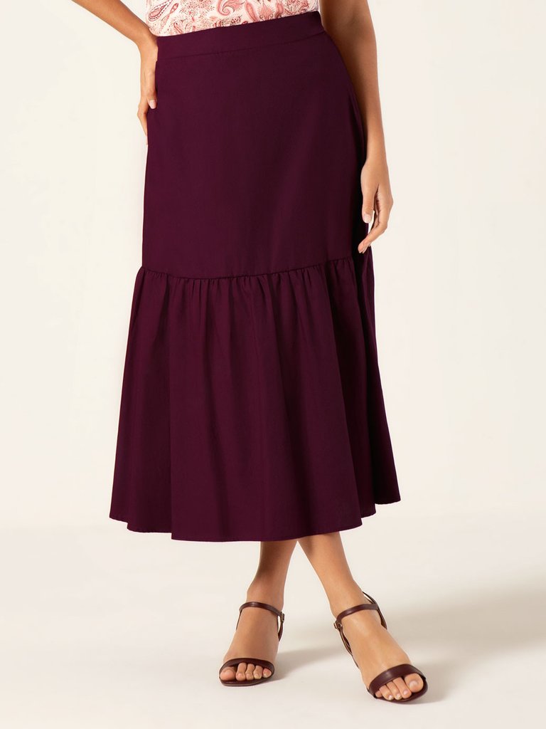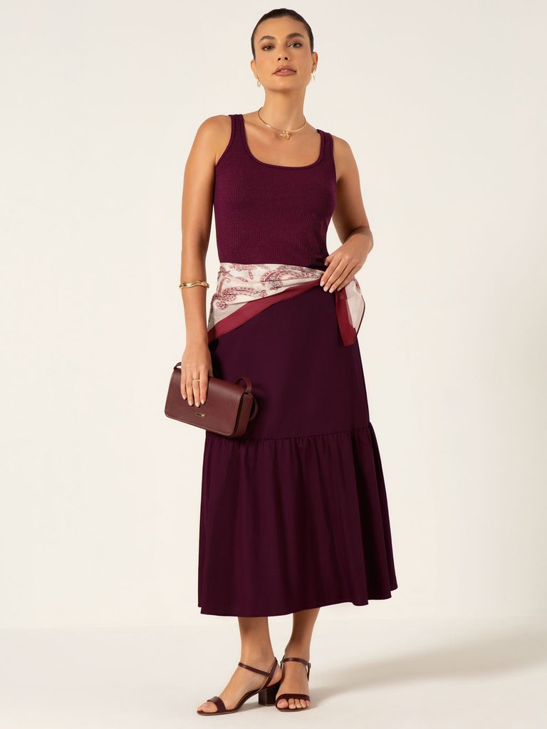 A saia Kauane possui comprimento maxi longuete, confeccionada em tecido de tricoline, uma matéria prima em algodão com alta respirabilidade e toque macio. A peça é em tom de vinho um verdadeiro clássico da moda, uma cor sofisticada, intensa e cheia de personalidade. Sua modelagem é alongada, favorecendo diferentes tipos de corpo com recorte duas marias e leve franzidos. O cós interno conta com elástico embutido na parte traseira, que proporciona conforto e melhor adaptação à silhueta, sem comprometer a estética da peça. Ideal para composições que exigem um toque de sofisticação com personalidade.